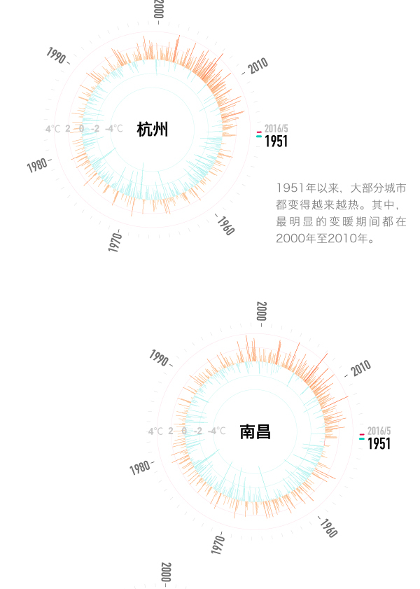 另外,多数城市的最高温和最低温都出现在2000年以后,其中,福州、杭州、长沙、武汉、南京、合肥的极端最高温值都出现在2003年。
