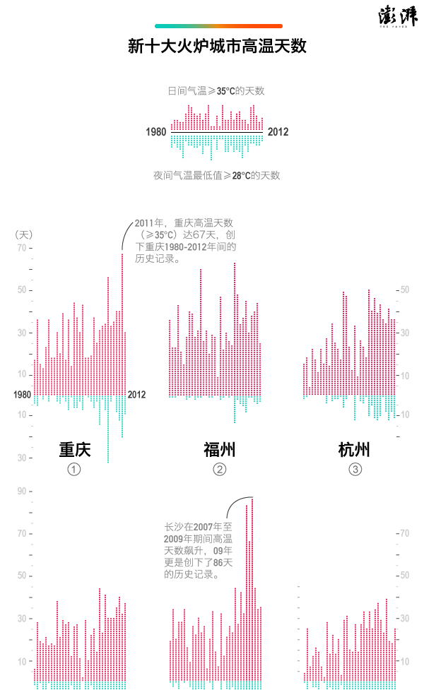 武汉市气象台台长说,判断一个城市是否炎热,需要考虑多种因素,比如最高气温、平均气温、35℃及以上的高温天数、气温日较差(指一天中气温最高值与最低值之差)、空气相对湿度等。澎湃新闻(thepaper.cn)整理了1980年至2012年前10个火炉城市的日值数据,让我们来看看新的火炉城市都是怎么“上位”的。