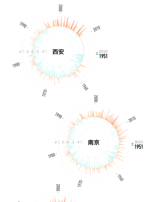 从上图中可以看出,几乎所有的城市相比1980年以前都有不同程度的变暖。重庆气温波动较小,看来重庆是一直都很热,从未被超越。其他多数城市都在2000年到2010年期间开始集中变暖,其中,杭州、武汉、西安、南昌、合肥等城市的变暖情况最为明显。一些城市在2010年之后变暖趋势有所减缓,武汉和南宁的平均气温相较近20年平均值甚至出现了下降。