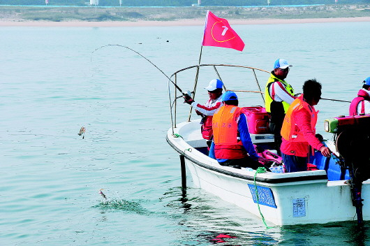 ▲海钓比赛中,队员在展示战利品。 记者 王震 摄