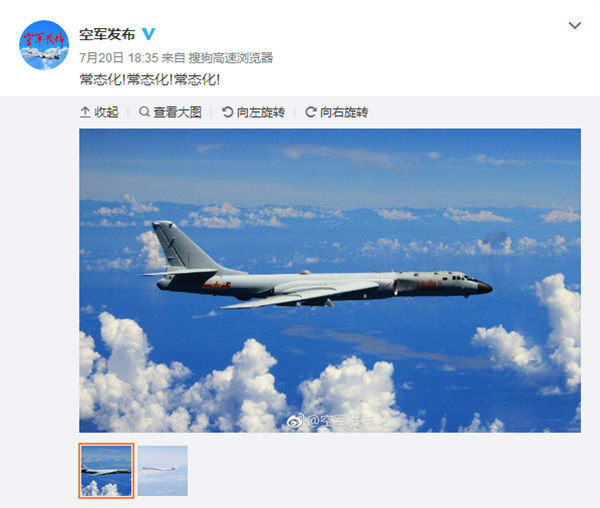 20日,中国空军官方微博“空军发布”发布了两张战机飞行图片,配文称“常态化!常态化!常态化!”