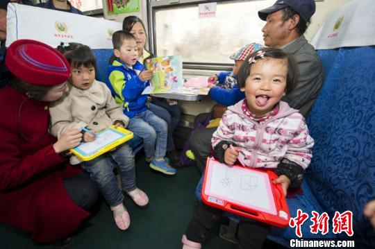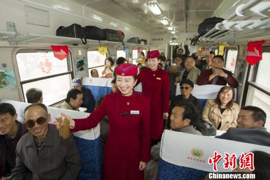 资料图。图为7504/7503“城乡文化号”列车的乘务员与乘客“互动”。 钟欣 摄