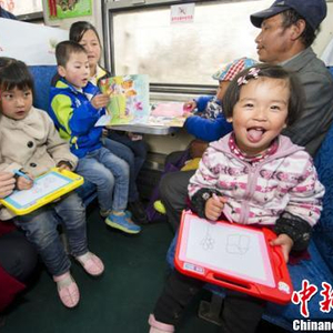 资料图。图为7504/7503“城乡文化号”列车工作人员为乘客表演自编自排的节目。 钟欣 摄