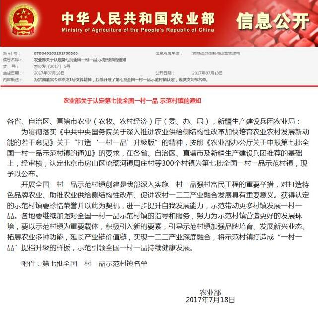 为贯彻落实《中共中央国务院关于深入推进农业供给侧结构性改革加快培育农业农村发展新动能的若干意见》关于“打造‘一村一品’升级版”的精神,按照《农业部办公厅关于申报第七批全国一村一品示范村镇的通知》的要求,在各省、自治区、直辖市及新疆生产建设兵团推荐的基础上,经审核,认定北京市房山区琉璃河镇周庄村等300个村镇为第七批全国一村一品示范村镇,现予以公布。