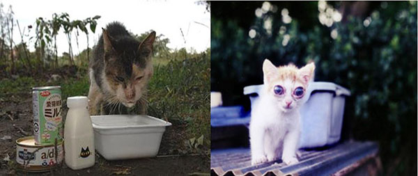 由西向东横贯关东的母亲河——多摩川河滨,近年已经成为东京流浪动物的栖息地,它们靠着人类丢弃的残剩便当与罐头苟活。自由摄影家小西修夫妇从1992年便持续关注多摩川的流浪猫多舛命运,左图为2009年9月拍摄的一只10岁的老猫,因为左下犬齿被人类利器打断,未能及时医治,又患上口腔溃疡,只能靠牛奶之类流体进食,当年12月死于寒潮中。右图是2013年拍摄的一只3个月大的猫崽,因为患有先天性青光眼,被无情抛弃在野外,后被收养。