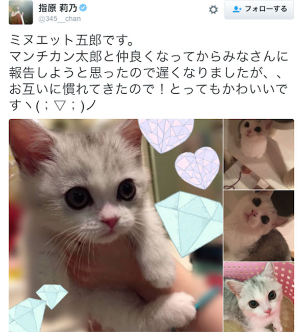 AKB48人气女王指原莉乃在推特上秀的拿破仑短足猫,这也是今年日本最火的人气猫种,2013年幼猫的价格在25~75万日元间,如今飙升到了100~300万日元。