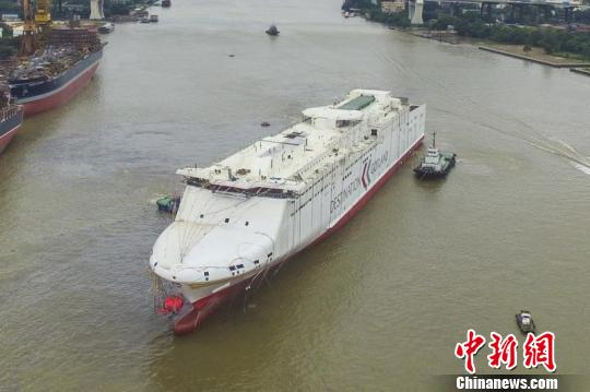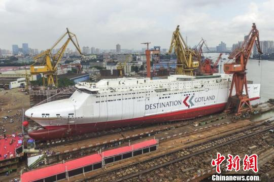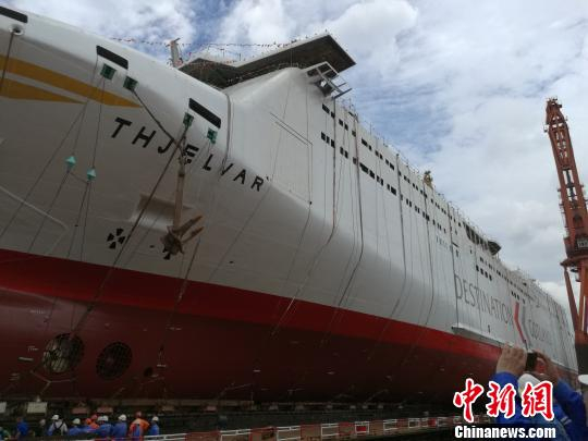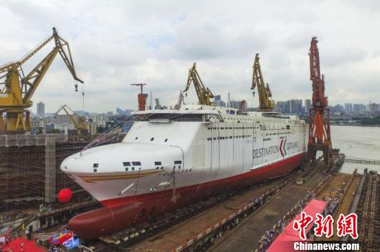 世界上速度最快、性能最优高端豪华客滚船在广州下水 陈骥旻 摄