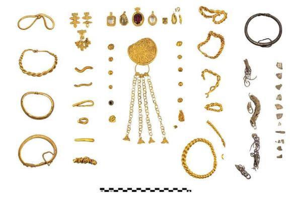 2016年12月,于同一地点出土了大量金属制品,总重约1000克,其中包括7件镶有宝石的金吊饰和9件用金线装饰的黄金珠宝。