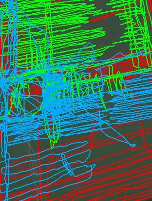 玉米的收获季节在10月底,还要再等一个月才能计划在这一代进行更大范围的搜索。这么长一段时间对我们来说真是度日如年,不过也给我们提供了参与博物馆活动,强化自己知识技能的机会。我们决定和这片“金田”周围的十二户地产业主签订书面协议,为未来的勘察工作和与博物馆相关的研究取得授权。这是名副其实的公民科学活动。在等待收获的时候,我们在周围区域的田地进行了探查。如今我们还采用了GPS跟踪系统来改善搜索效率:玛丽的线路用红色标记,保罗的是绿色的,我的则是蓝色的。这种方法能让我们很快找到遗漏的区域,并且比较各自搜索方法的优劣。