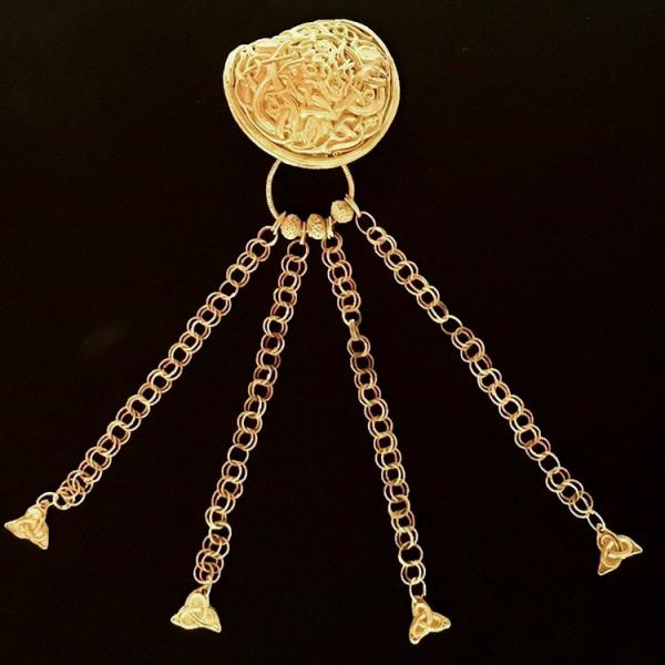 1件精美的黄金胸饰,有凸起纹饰,坠有三颗金珠,连接着4条金链,每条金链一端各有一个三角形凸纹吊坠