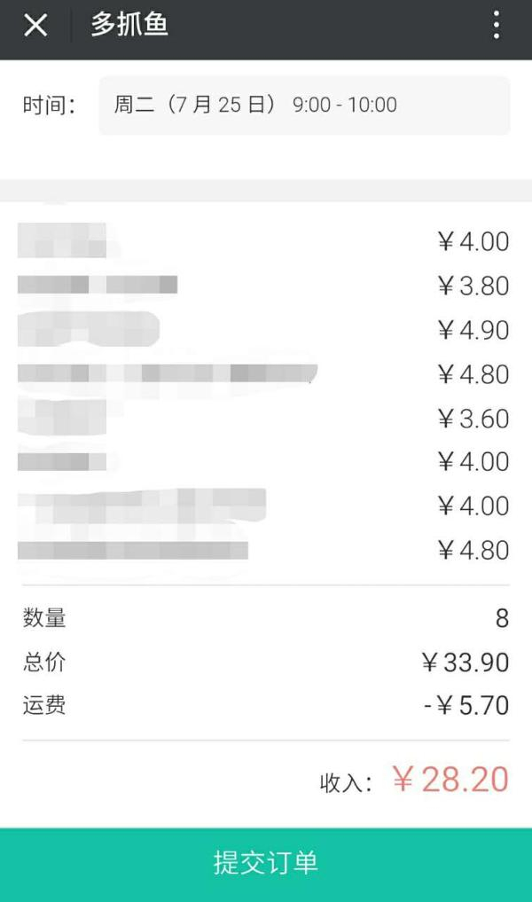 澎湃新闻记者尝试在“多抓鱼”下单卖书。在添加图书时,发现一本童书和一本讨论爱情和医学的图书没有通过审核,向李婵核实后发现是因为豆瓣评价人数过少导致被拒的。而其他8本图书都是以1折的价格收购的,共计33.9元,减去需要承担的30%的快递费用5.7元,共可收入28.2元。同时,预约快递上门取书可精确到小时。