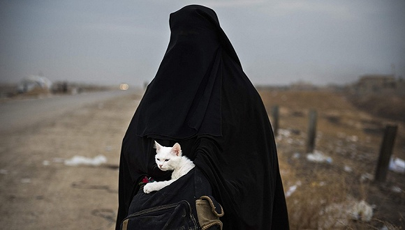 2016年11月10日,伊拉克摩苏尔,Intisar地区一名无家可归的伊拉克女性抱着猫。图片来源:视觉中国