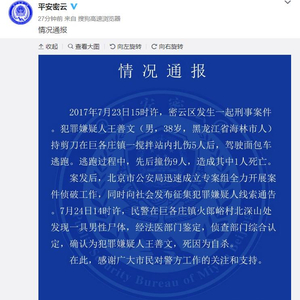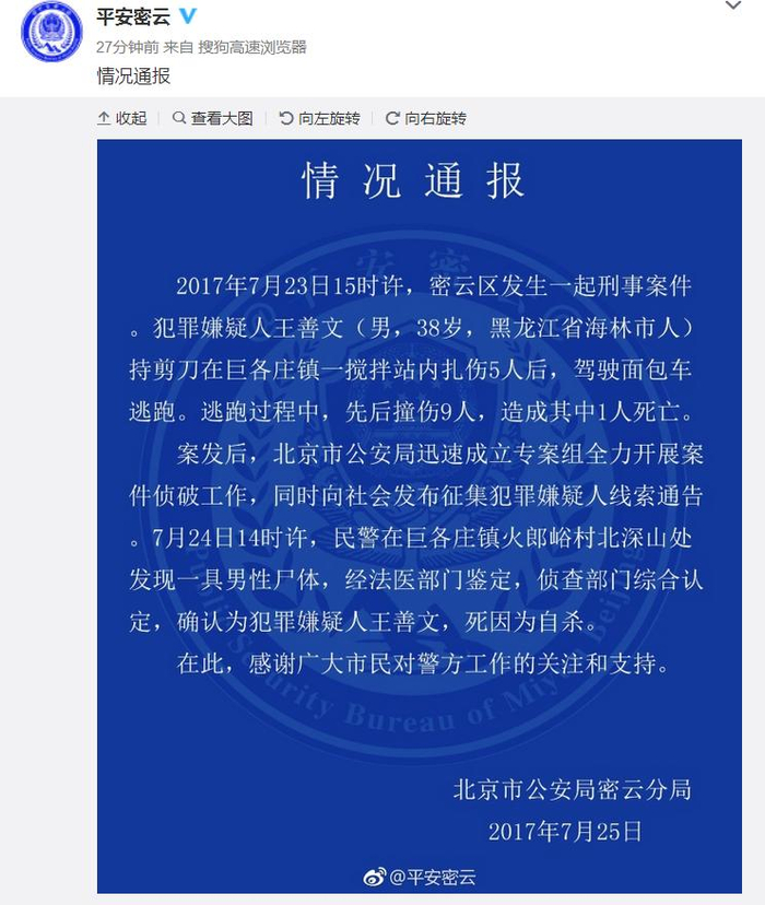 北京警方确定密云致1死13伤嫌犯死亡 系自杀身亡