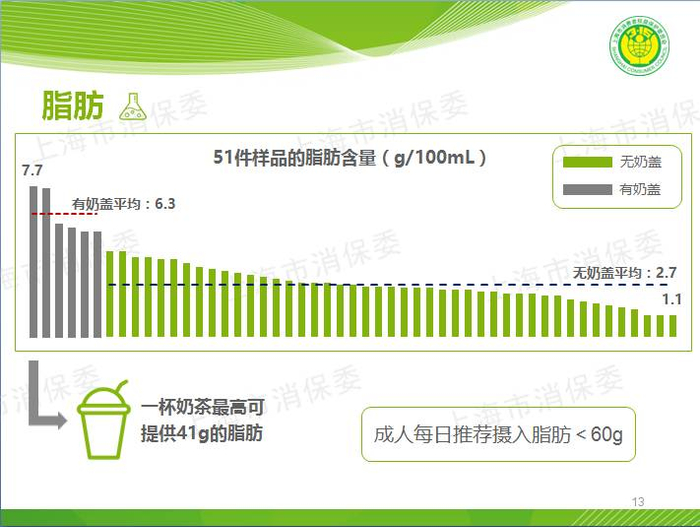 脂肪含量最多的一杯奶茶可提供41g的脂肪,超过成人每日推荐摄入脂肪量的2/3,而成人每日推荐摄入的脂肪小于60g。