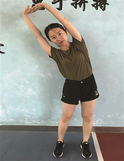 站立或坐在瑜伽垫上;举起双臂,掌心向上、十指从头顶交叉向握;身体向侧向弯曲直到背部出现绷紧的感觉。在该位置上保持20秒,根据个人情况重复2-3次。