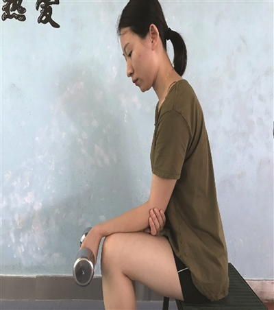 准备姿势:坐在训练凳或椅子上,双脚保持与地面接触;左侧小臂紧贴左侧大腿,左手掌心向下持哑铃于左侧膝关节位置。