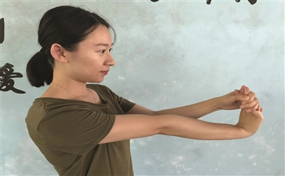 站立或坐在椅子上;右侧手臂伸直,腕关节保持伸展;左手掌心握住右手并用力向后拉右手直到腕关节出现绷紧的感觉。每次持续10秒,根据个人情况重复2-3次。