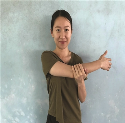 站立或坐在瑜伽垫上;右臂前伸,肘关节弯曲;左手从右臂下方将右侧肘关节向后拉直到肩关节出现绷紧的感觉。在该位置上保持20秒,根据个人情况重复2-3次。