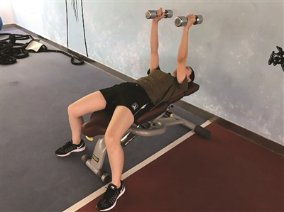 准备姿势:身体平躺在训练凳上,双脚贴紧地面;肩关节外展,大臂与身体近似90度,肘关节微屈,双手持哑铃。
