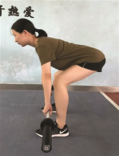 准备姿势:双手握住杠铃杆,双脚与肩同宽,髋关节弯曲、躯干保持平直;