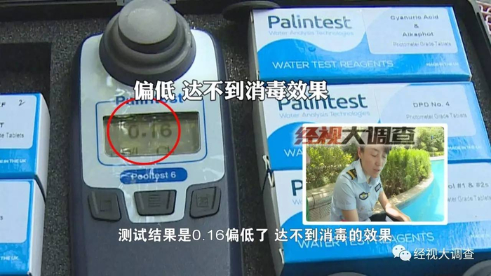执法人员表示,池水中游离余氯量低于国标将起不到杀菌的作用,高出标准则会对人体带来伤害,随后执法人员又选取了靠近进水口的位置进行检测,结果令人震惊。