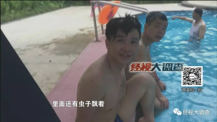 这里泳池的水到底有多脏呢?晚上7点正是游泳的高峰期,记者购买了三十元的游泳票进入泳池,此时池里聚集了有将近一百人在游泳,池水里掺杂着一些爬虫和絮状物,可这里的工作人员对池水依然十分有信心。
