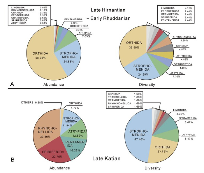 华南奥陶纪末大灭绝前后腕足动物高级分类单元相对丰度及多样性对比