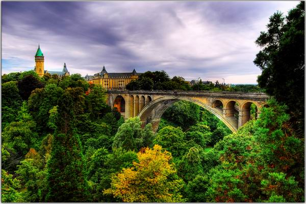 如果在比利时不赶时间的话,还可以花上一天时间从布鲁塞尔坐三小时左右的火车去卢森堡看看。由于国土小、古堡多,卢森堡又有“袖珍王国”“千堡之国”的称呼。它被阿尔泽河和佩特罗斯河分为两部分,中间是河谷地带,而新旧两城就被河谷分为两部分,有100多条桥梁相连,其中有古色古香的砖墙,亦有现代化的金属桥,建筑精巧,各具特色。