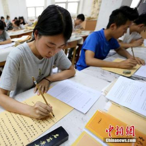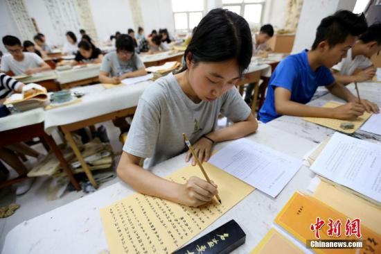 资料图:考生用毛笔小楷答卷。中新社记者 张远 摄
