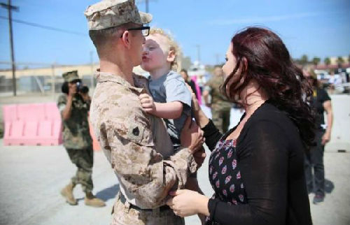 5月11日,美国海军陆战队上士威廉·普罗克特在加利福尼亚州彭德尔顿营与家人团聚,准备共度第二天的“军人配偶节”。(盖帝图像)