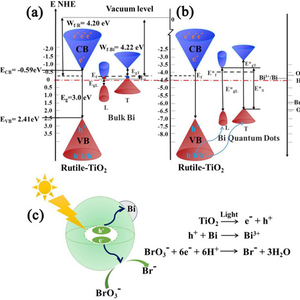 图1 (a)块体Bi/TiO2 (rutile)与(b)纳米Bi/TiO2 (rutile)复合光催化材料能带结构对比示意图。(c)纳米Bi/TiO2 (rutile)复合光催化材料光催化还原溴酸根原理图。