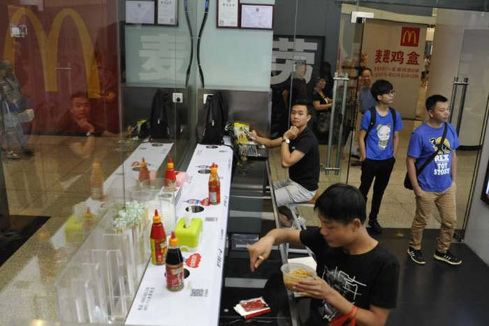 只有一个巨大的点餐牌、两个点餐液晶屏、两个供取货的机器。