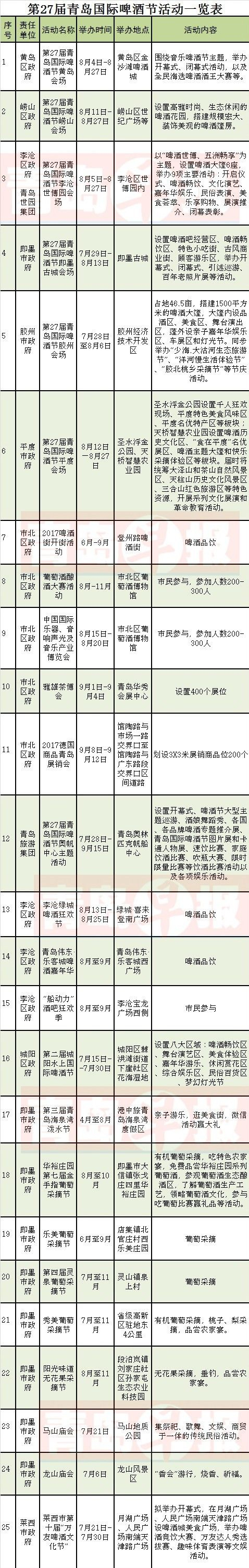 与此同时,市南、市北、李沧、城阳、莱西等区市,将结合啤酒节开展19项主题活动,活动内容涵盖啤酒节嘉年华、水上啤酒节、登州路开街仪式、酿酒大赛、葡萄采摘、庙会等,时间自6月份持续至11月份,让市民与游客参与和感受节日的狂欢氛围。