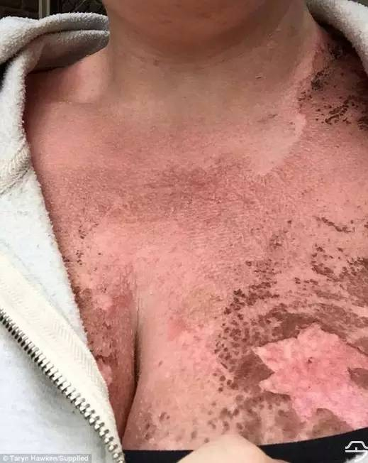▲据《每日电讯报》报道,今年2月份,澳大利亚姑娘泰伦·霍肯去墨尔本西南部游玩,使用了香蕉船30倍的防晒霜,据她说,她在下车前45分钟就涂过,之后的每个小时都会补涂。结果游玩结束之后,她的手和胸部被严重晒伤。经过检查后医生表示,她的胸部晒伤太过严重,可能需要植皮。