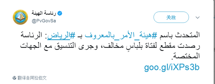 18日,沙特宗教警察逮捕了视频中的女子。随后,沙特劝善惩恶协会在官方推特上回应: