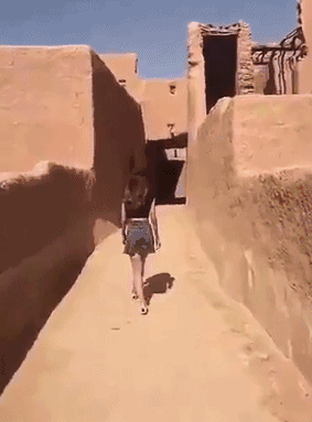 视频中,一名沙特女子身着露脐上衣和超短裙,一头棕褐色秀发裸露在外,在沙特一座古城中散步。