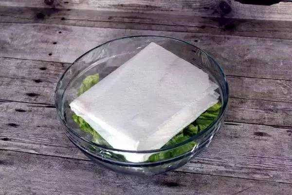把青菜放在碗里,然后垫上一张厨房纸,封上保鲜膜后放入冰箱保存,可以一个礼拜都不坏,依然新鲜爽脆!