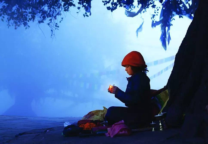 树下,一个卖酥油灯的小贩。