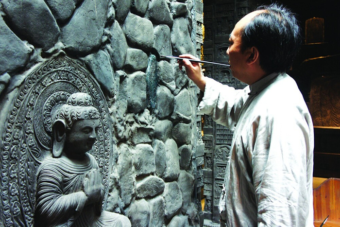 如果说像法时代的石窟只不过是先民们敬畏自然之心的质朴流露,那么置身末法时代的陈春甫则是在“逆水行舟”。佛说:“汝今欲逆生死欲流,返穷流根,至不生灭,当验此等六受用根⋯⋯”复原式佛教雕塑创作大概就是陈春甫的“返穷流根”之途,这意味着他的每一项复原工作都不只是在重现造像的外貌,而且也是在追寻曾经的情境,那些情境让我们重新审视过程的重要性。在技术尚不发达的时代,每一尊造像的工作都必须从原材料的采集与制备开始。在现代的“艺术家”看来,那些极其枯燥乏味的过程是很不艺术的,甚至是低下的,他们急于用现成的材料去抒发“情感”,表达“思想”,追求“格调”。然而,现代人的空虚感正是根源于各种过程的消亡,一开始只是为着生存的艰辛劳动过程的消亡,继而是贪图便利带来的日常行为过程的消亡,最终将是生活过程的消亡,乃至精神的消亡⋯⋯