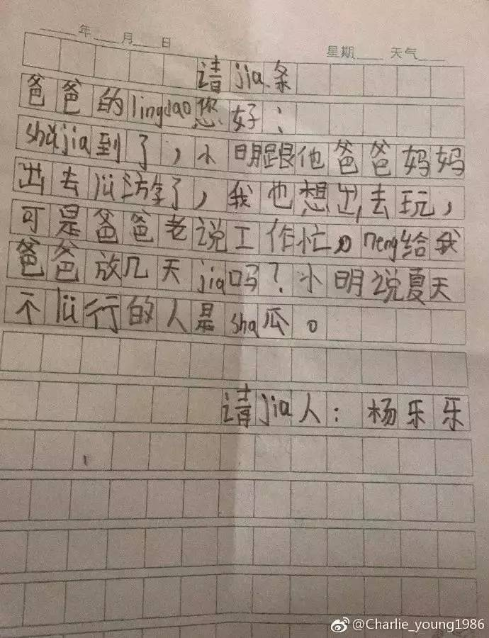 今天这张请假条火了,爆料的网友表示:之前答应孩子暑假陪他去旅游,可是因为工作太忙迟迟没有兑现,没想到他居然帮我写了一张请假条让我转交给老板,所以,这请假条我是交呢?还是不交呢?