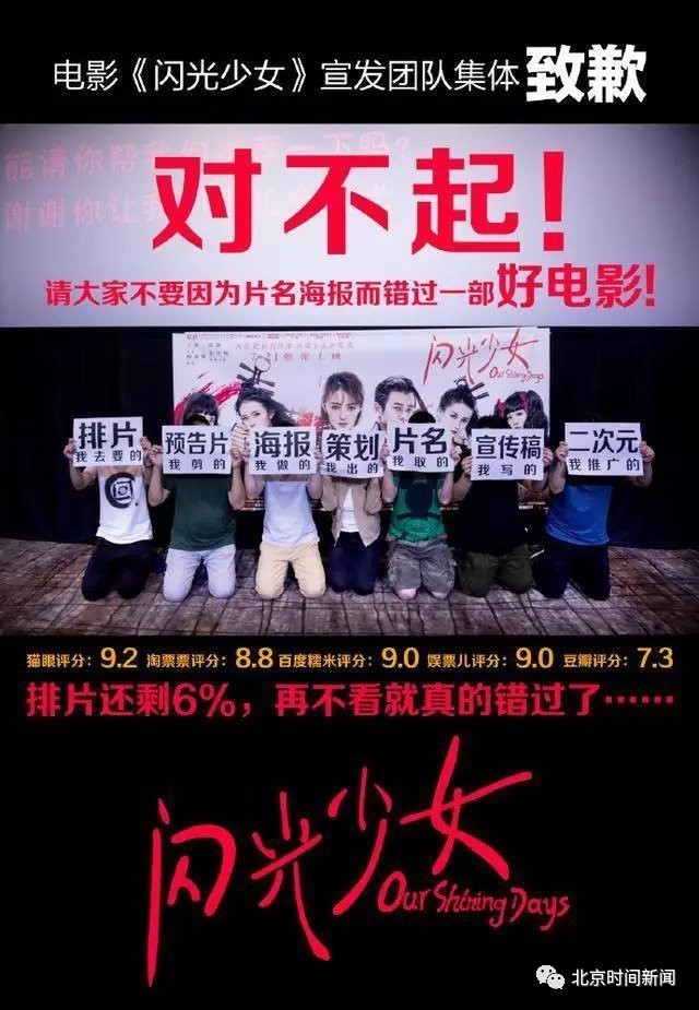 日前,上映五天的青春片《闪光少女》官微发布一张“下跪致歉”海报,并配文,“对不起,请大家不要因为我们的失误而错过一部好电影!——电影闪光少女宣发团队。”