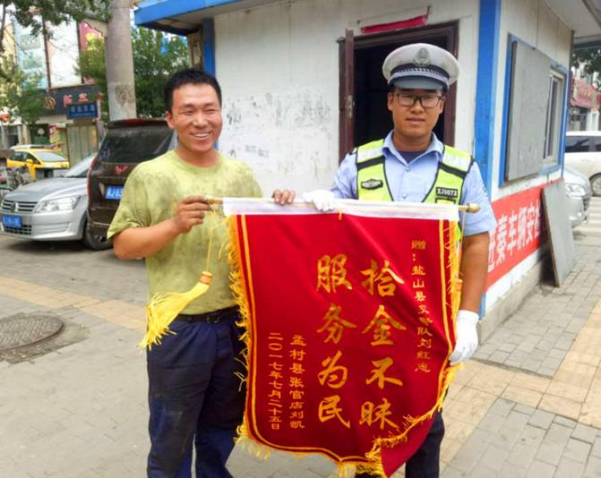 7月26日,孟村县张官店村的刘先生把一面锦旗送到盐山交警刘红志的手中,对民警拾金不昧的行为表达深深的谢意。
