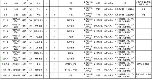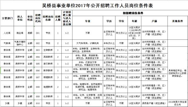 招聘对象为2017届及以前毕业的毕业生。硕士研究生及以上学历人员、2017年毕业的全日制普通类高等院校应届毕业生面向全国招聘;其他报考人员除报考招聘单位要求不限户籍的岗位外,须具有沧州市所辖县(市、区)户籍(或生源地)或吴桥县户籍(或生源地)。