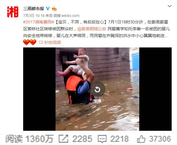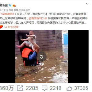 今夏,湖南遭受历史罕见暴雨袭击。7月2日,一段民警抗洪抢险的视频在网上火了:暴雨中,一位民警举着婴儿向安全地带转移,婴儿大声啼哭着,而民警却紧紧地把他托住,在齐胸深的洪水中小心翼翼地艰难前行。