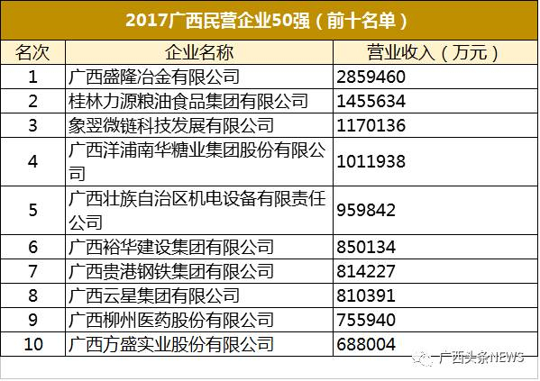 占据2017年广西企业百强榜前十的大部分是国企,和去年一样,广西盛隆冶金有限公司依旧是唯一跻身前10的民营企业。