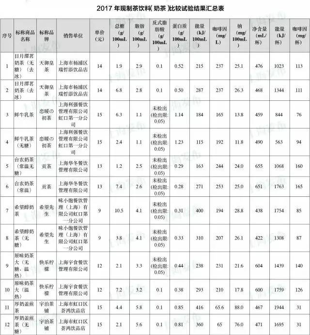 试验人员委托上海市营养食品质检站,对奶茶中的糖分、脂肪、反式脂肪酸、咖啡因等进行了检测。