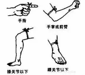 扎结越早进行越好,可用绳子或者把衣服撕成布条,伤口(圈点)和结扎部位如图。结扎以动脉血能够通过,静脉血不能回流为度。也就是说,结扎的时候,远心端可以摸到动脉的搏动,这种松紧度,和我们平时在医院抽血化验时,那种橡胶管绑的松紧度差不多。每半小时到1小时松开结扎3分钟。再得到有效治疗后即可松开。