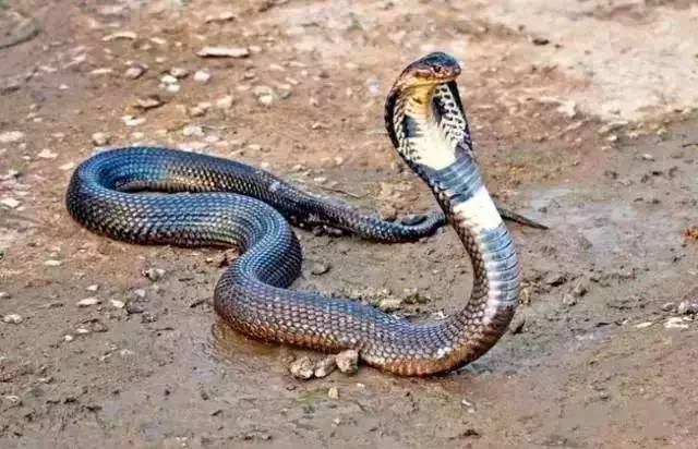 眼镜王蛇受惊会竖起前半身,还会主动攻击人,形似勺子,会喷射毒液,毒性猛烈。