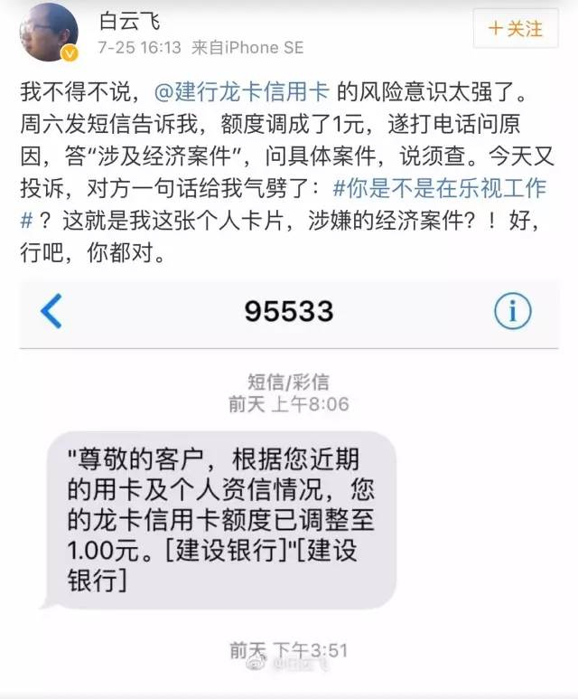 网友“白云飞”在上周六突然接到建设银行短信通知,自己原来额度7万多的信用卡突然被降到了一块钱,他赶紧打电话询问银行,被告知,他的卡涉及经济案件: