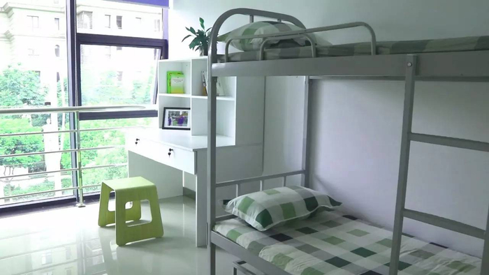 除了厨房,二层的其他房间分别被分为两间二十平左右的宿舍、一间活动健身房和一间休息室,宿舍里整齐摆放的四张上下铺都铺上了统一的绿白格子床具,白色柚木的书桌上放着团队集体的合照,上面的每一个人都像一家人,其乐融融,笑眯了眼。